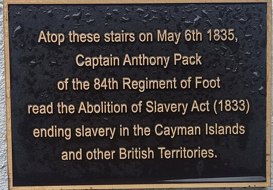 The photo displayed is the plaque on the main stairs of the Great House at Pedro St. James. When slavery was officially abolished in the Cayman Islands, it is estimated the population of the Cayman Islands was 2,000, of which about 50% of the population were slaves.